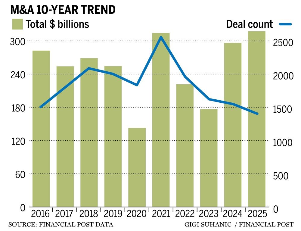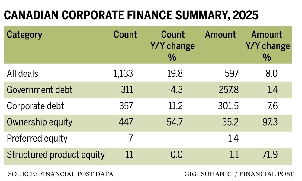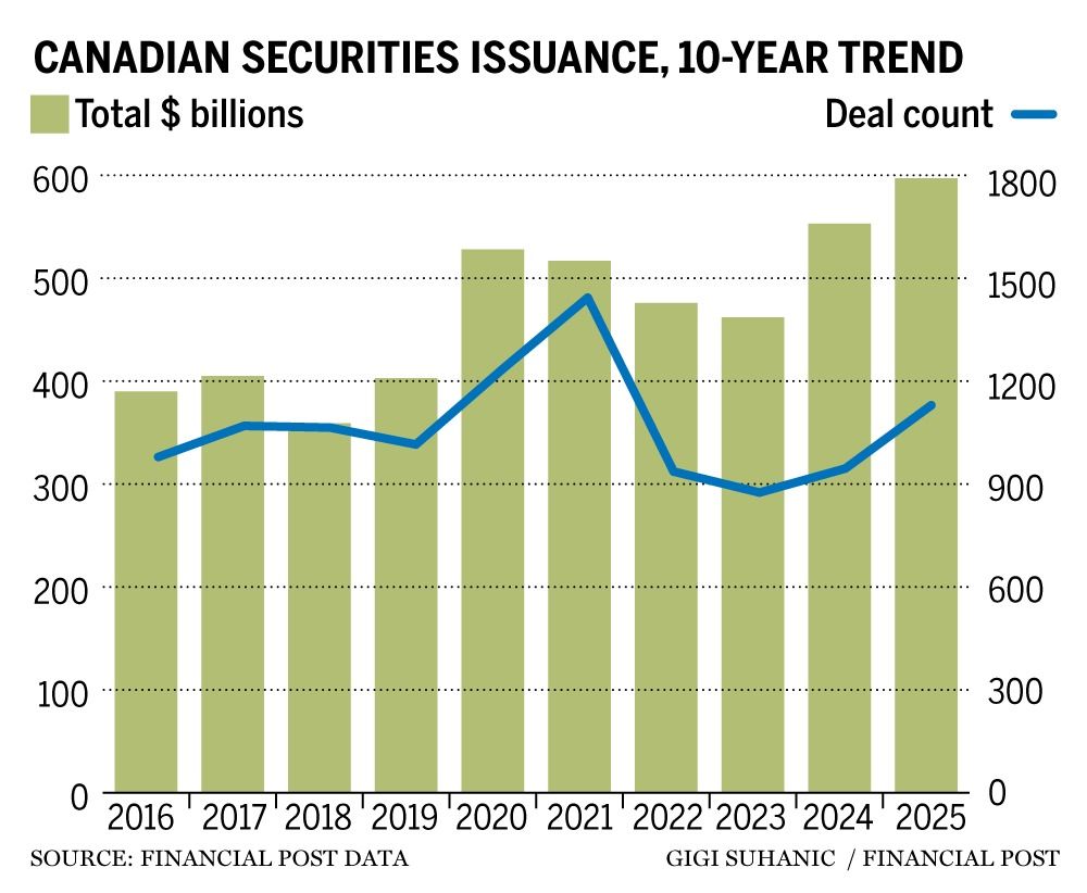 Overall, the capital markets sector raised about $597 billion in 1,133 deals during 2025, the highest dollar amount in the past 15 years and up eight per cent from $553 billion in 2024, according to Financial Post Data.