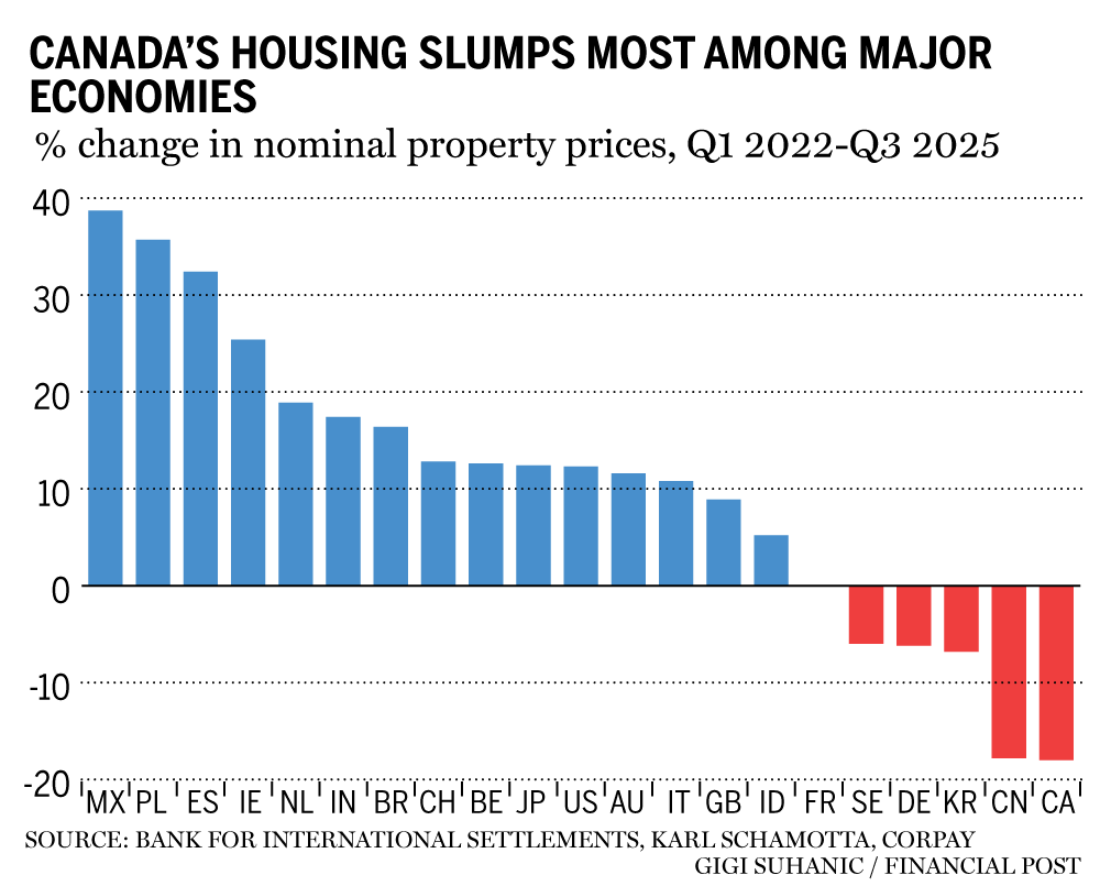 Looking past the most-recent quarterly data, home prices in Canada plummeted 18 per cent in nominal or actual money terms from the first quarter of 2022 to the third quarter of 2025, outpacing a 17.8 per cent decline in China during the same period, BIS data showed. South Korea had the third-largest decline at 6.8 per cent, followed by a 6.2 per cent decline in Germany and a six per cent decline in Sweden. — Gigi Suhanic, Financial Post