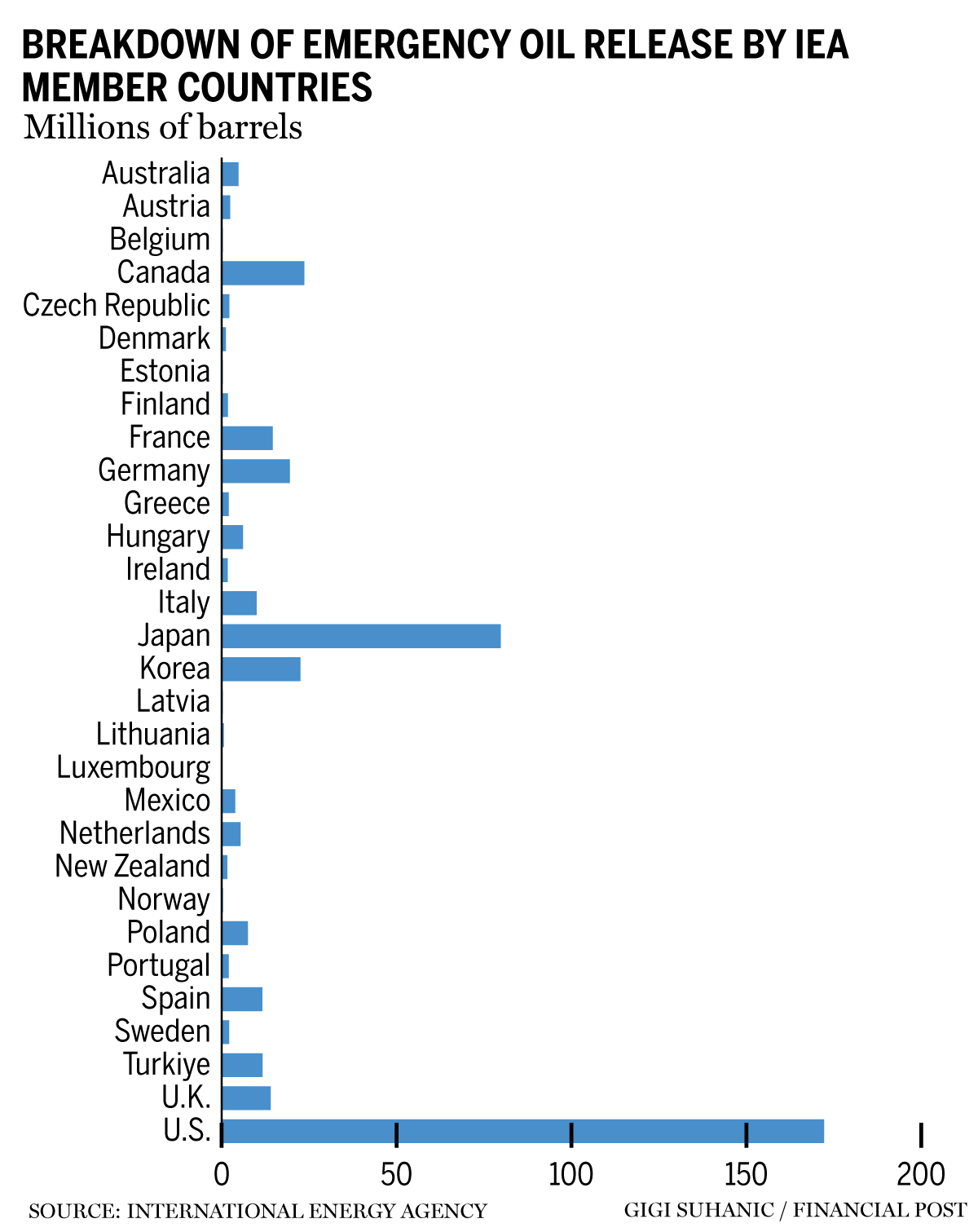 Thirty IEA member countries have pledged a total of 426 million barrels of oil and oil products after Iran blocked transit through the strait, which handles about 25 per cent of the world’s seaborne oil exports.