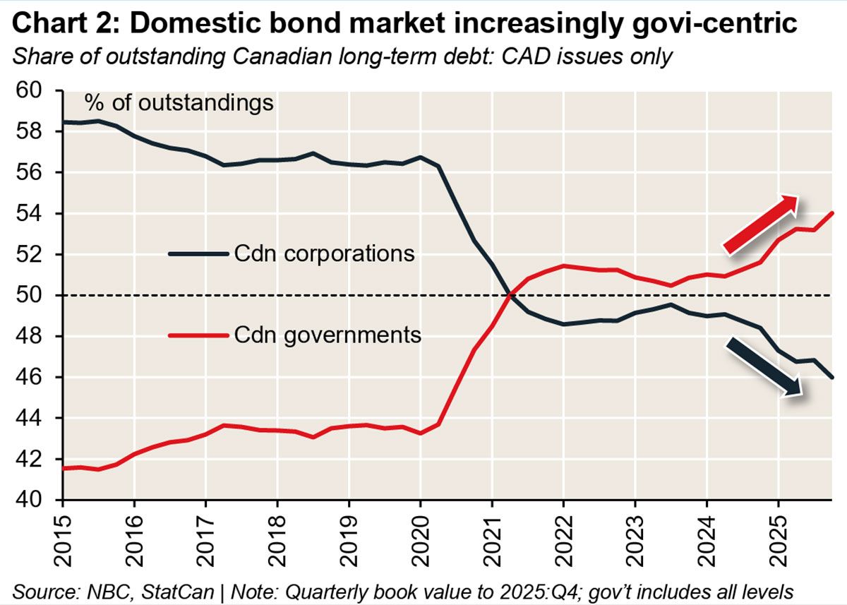 There were nearly $170 billion in net new issues in 2025 and all of that net bond supply came from the government sector, as net domestic borrowing by financials fell back, said Warren Lovely, economist with National Bank of Canada.